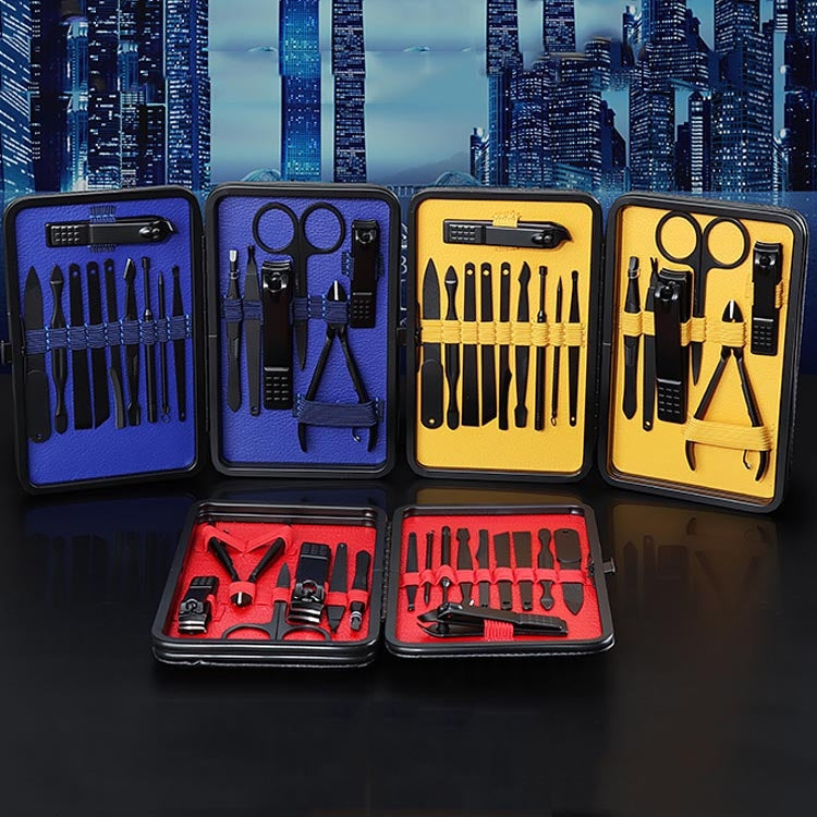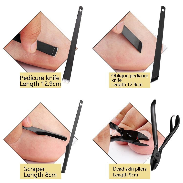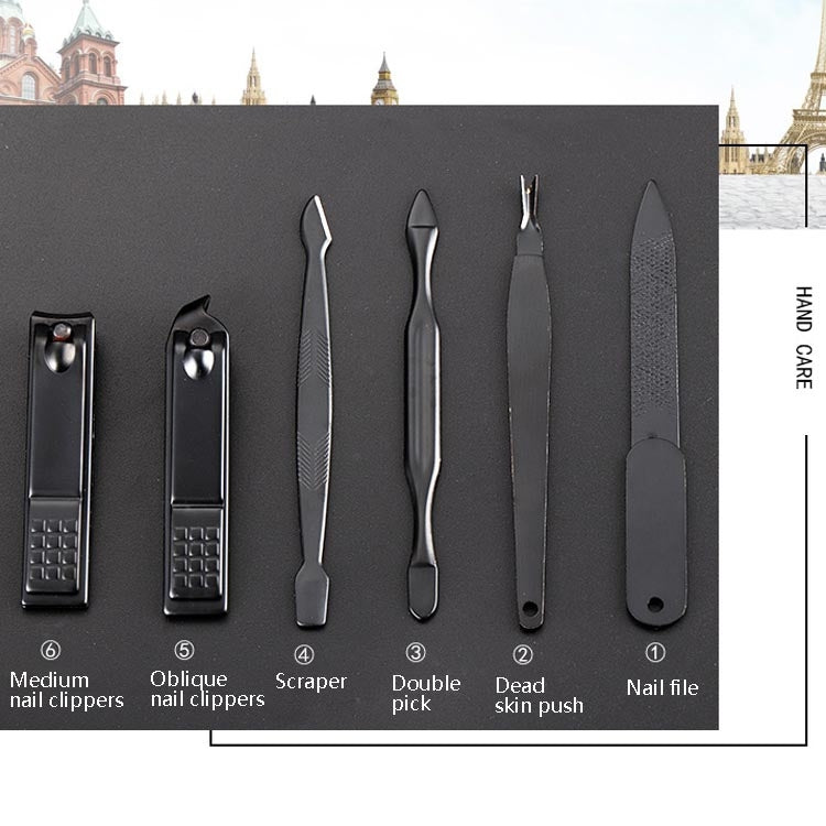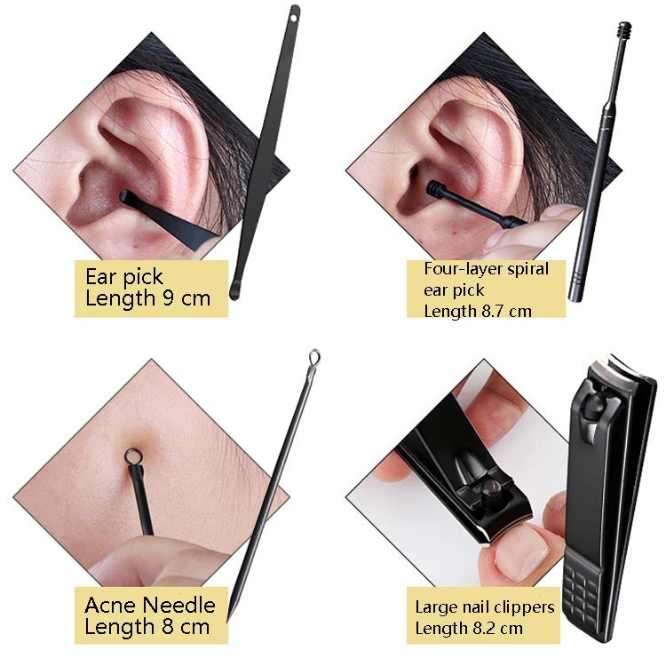 5. Contains: medium nail clipper length 5.8 cm, oblique nail clipper length 6 cm, nail file length 9.2 cm, dead skin push length 8.5 cm, double-ended pick length 7.7 cm, shaver length 8.8 cm, eyebrow trimmer length 9 Cm, eyebrow tweezers length 6.1 cm, pedicure knife length 12.9 cm, oblique pedicure knife length 12.9 cm, skin scraper length 8 cm, dead skin forceps length 9 cm, ear pick length 9 cm, four-layer spiral ear spoon length 8.7 Cm, acne needle length 8 cm, large nail clipper length 8.2 cm