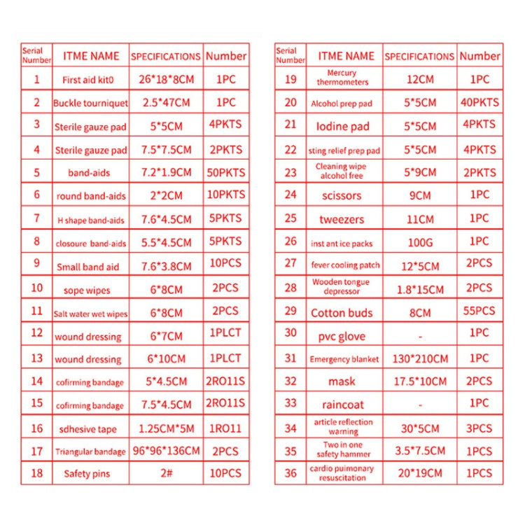 4. The product contains: first aid kit * 1, snap tourniquet * 1, sterile gauze sheet (5x5cm) * 4, sterile gauze sheet (7.5x7.55cm) * 2, conventional wound dressing * 50, round wound dressing * 10, H-type band-aid * 5, finger-tip-type band-aid * 5, small-scale band-aid * 10, soap liquid wipes * 2, saline wet wipes * 2, sterile accessories (6x7cm) * 1, sterile accessories Sticker (6x10cm) * 1, Elastic bandage (5x4.5cm) * 1, Elastic bandage (7.5x4.5cm) * 1, tape * 1, Triangle bandage * 2, Safety pin * 10, Mercury thermometer * 1, Alcohol disinfection * 40, iodophor * 4, mosquito repellent wipes * 4, disinfection wipes * 2, safety scissors * 2, plastic tweezers * 1, cold ice pack * 1, cooling stickers * 2, wooden tongue depressor * 2, cotton swabs * 55, PVC gloves * 1, first aid insulation blanket * 1, disposable masks * 2, raincoats * 1, reflective warning strips * 3, 2-in-1 safety hammer * 1, artificial breathing valve * 1