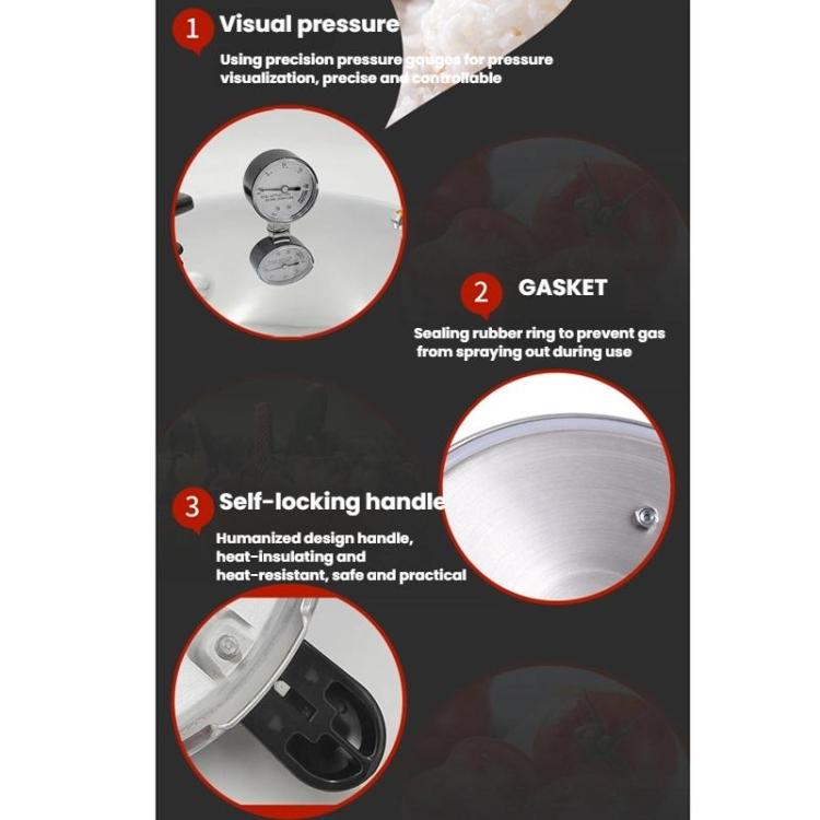 1. This commercial-grade 32cm/23L aluminum alloy pressure cooker features a built-in pressure gauge and universal compatibility with induction cooktops & open flames. Available in two models: Fixed 100kPa or 3 Adjustable Pressure Settings (35/70/100kPa).