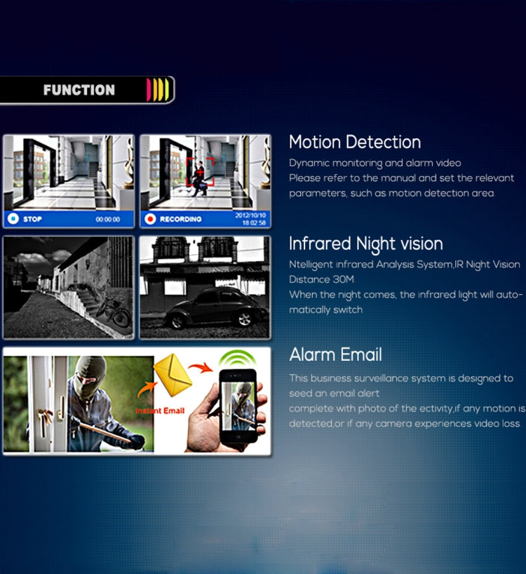 16. Motion Detection: Each screen can be set to 192 (16*12) detection areas; Multi-level sensitivity can be set (Limited local channel).