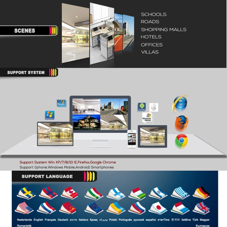 9. Network: Powerful network services (support DHCP, PPPOE, FTP, DNS, DDNS, EMAIL, IP searches etc.) And perfect support (WEB, Client, SDK), easy to achieve interoperability.