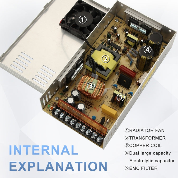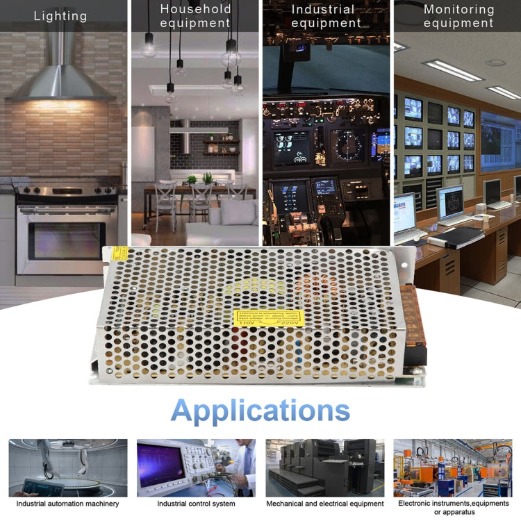 1. Switch power supply, convert AC 110V/220V to DC 12V . 2. Dual input voltage: AC 110V/220V. There is a switch, choose the proper voltage before use. 3. Steady and precise output voltage. 4. Shortage protection, overload protection, over voltage protection. 5. Widely used as the power adapter for Led strip, LED display, billboard, industrial equipment, etc. In-door use only! 6. Auto-recovery when converter is back to normal operating. 7. Stable and reliable performance. 8. Easy and simple installation.
