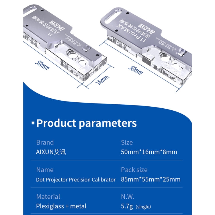 1. Precise alignment and quick fit 2. Standard positioning, magnetic reset 3. Realize the standardized maintenance of dot projector alignment 4. Adopts transparent polymer material + metal 5. Reset test of iron frame deformation 6. A work of ingenuity