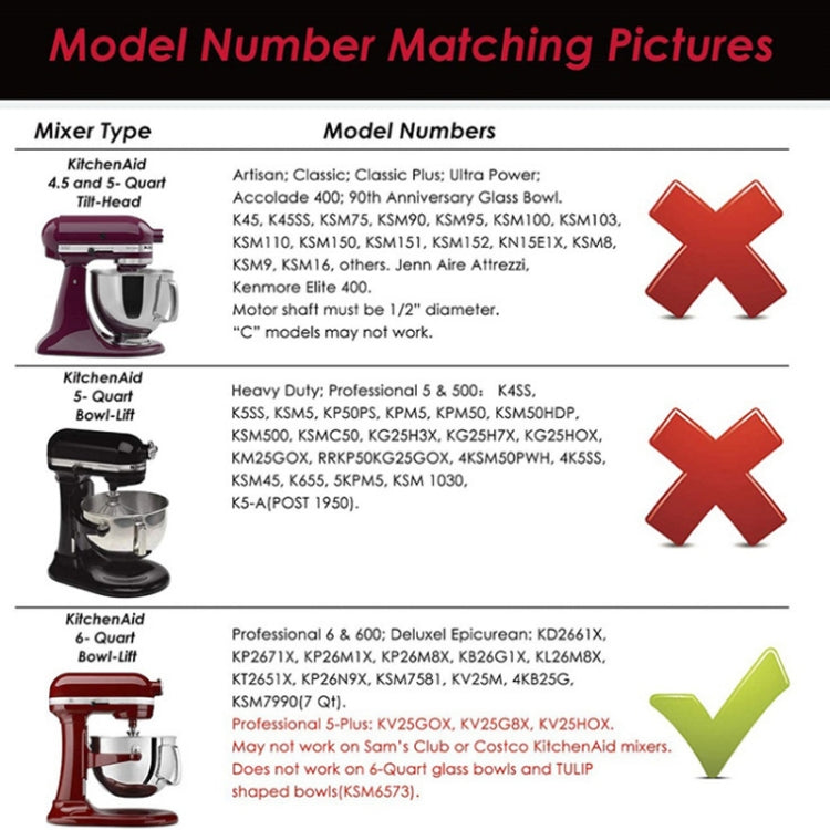 4. For KitchenAid Model: Professional 6 & 600 Series, Deluxe Epicurean: KP26M1X, KB26G1X, KL26M8X, KD2661X, KP2671X, KP26M8X, KT2651X, KP26N9X, KSM7990 (7 Qt) KP26N9X and KSM7581. Professional 5-Plus: KV25GOX, KV25G8X, KV25HOX
