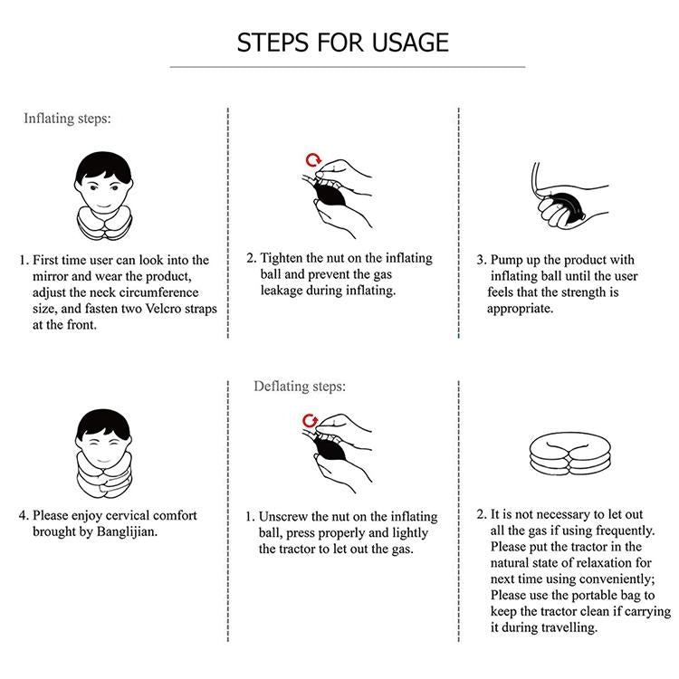 2. Inflation should be done step by step, not too fast. When you experience dizziness and other abnormal reactions during traction treatment, you should slowly deflate until the undesired symptoms disappear, and then readjust the use.