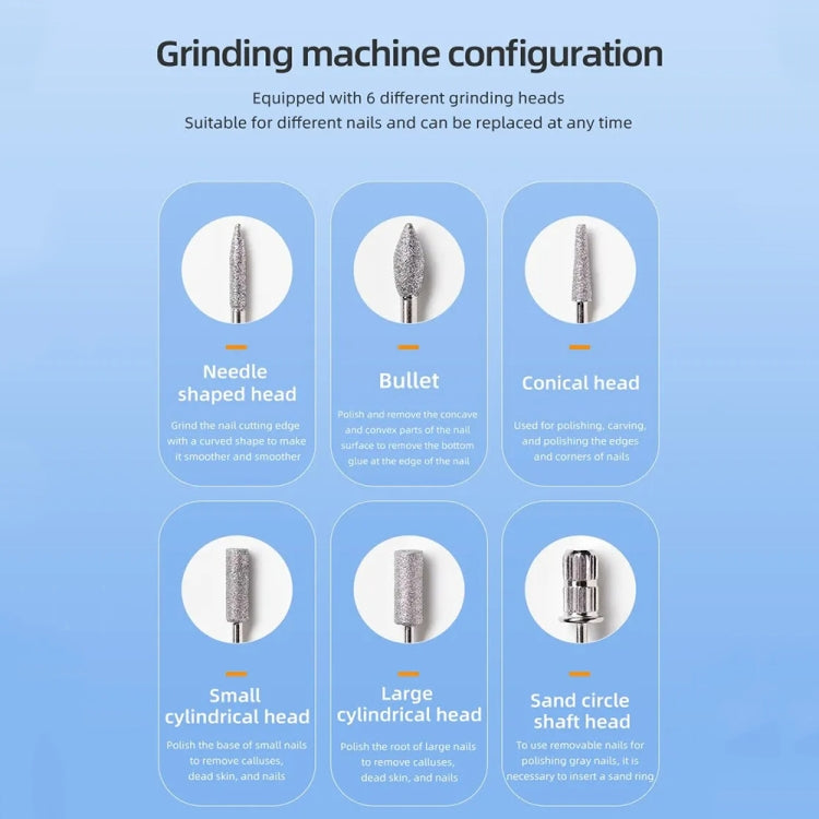 3. Equipped with 6 different polishing heads, suitable for different nails and can be replaced at any time