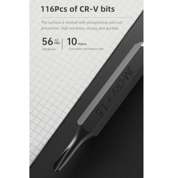 2. 116 pcs screwdriver bits: including hex, crosshead, Torx, slotted, pentalobe, square, and more.