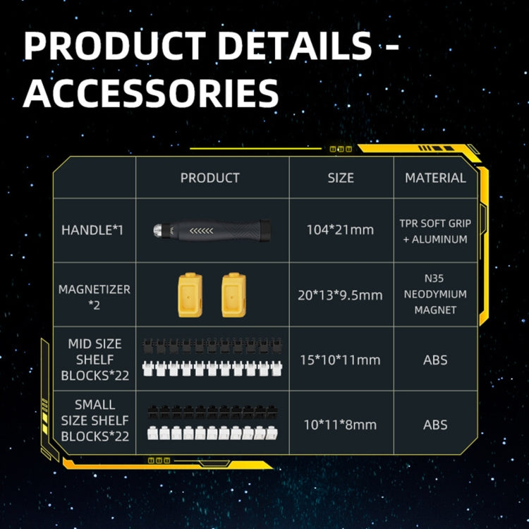 8. Built-in N35 industrial-grade strong magnet. Enhanced suction capacity for the screwdriver bits, so that even small screw parts can be easily operated.