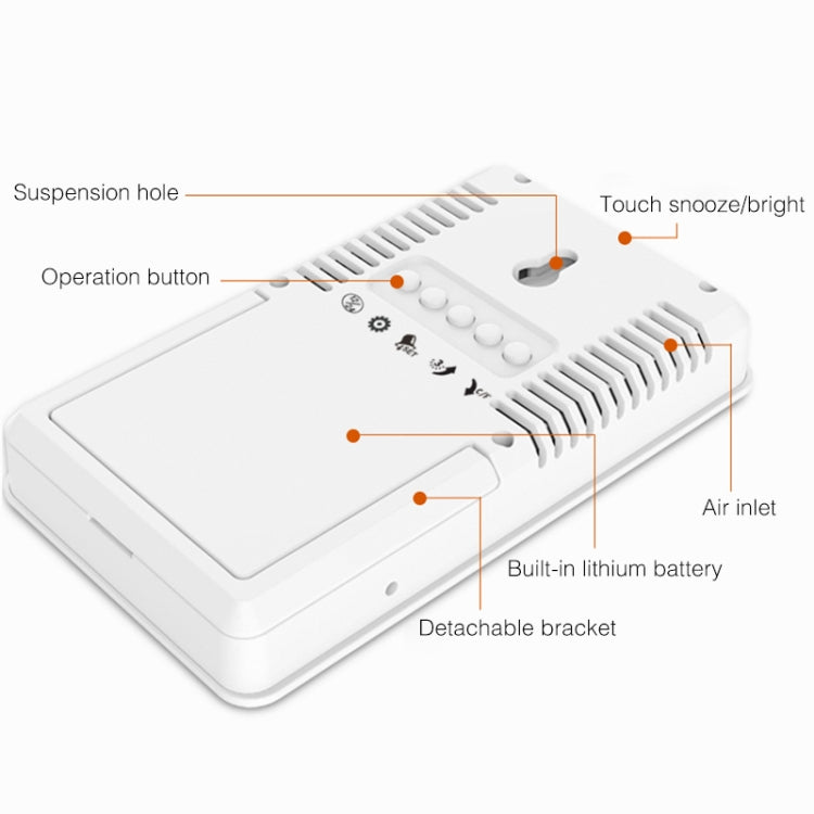 4. Function description: temperature display, humidity display, historical maximum and minimum temperature humidity record within 24 hours, alarm clock function, time function, date display, button top backlight