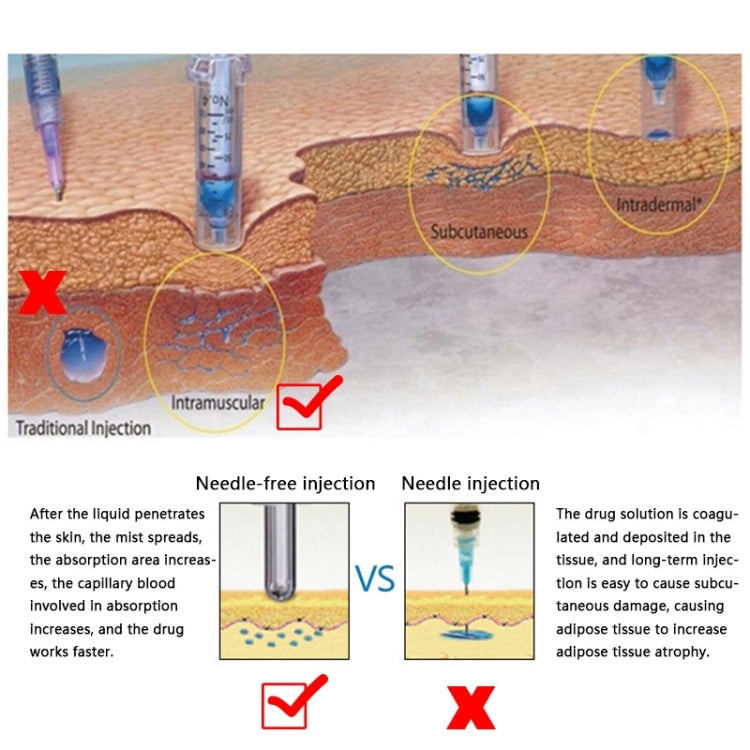 With mechanically acting energy, springs and special pistons in the device can push the drug flow through the tiny holes into the subcutaneous tissue quickly but slowly under pressure. The process of absorption is much faster than the introduction of needles, which has been confirmed in a series of studies and tests conducted in different countries around the world. The ideal solution for those who are prone to leaving scars and subcutaneous blood clots.
