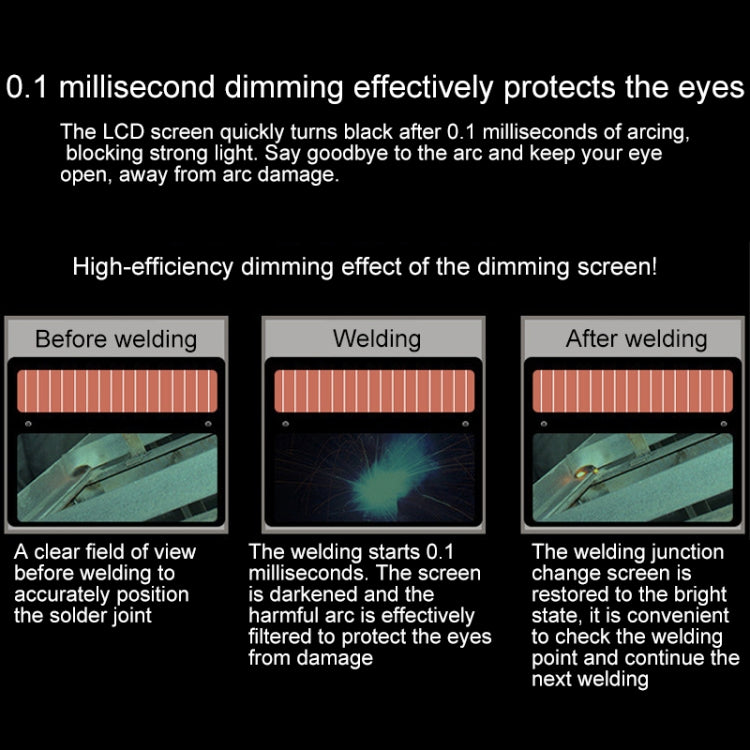 1. The automatic dimming filter lens can prevent ultraviolet, infrared, splash and welding radiation, and avoid the side effects of arc on the face and eyes