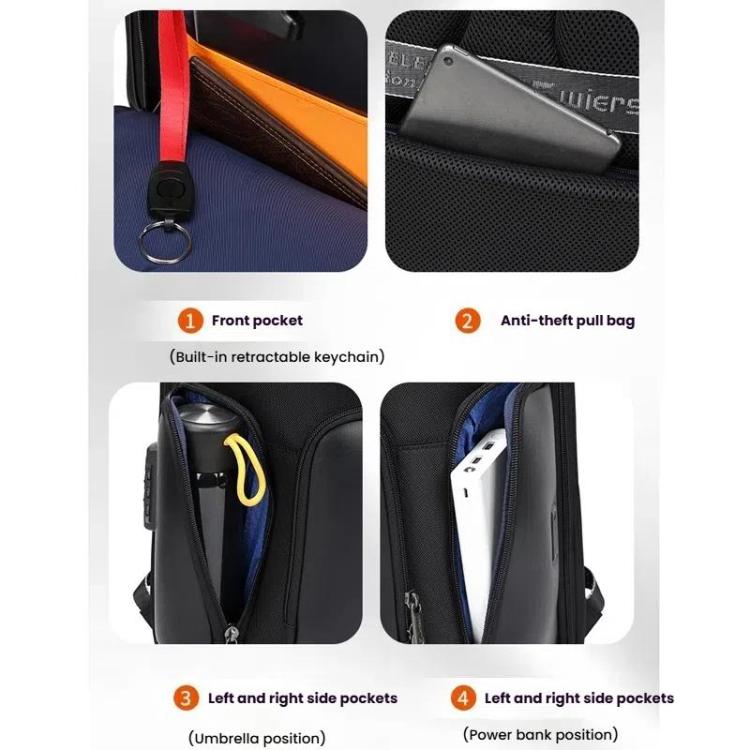 2. Multi-compartment & multi-pocket design: Main compartment + electronics compartment + front zippered pocket + dual side pockets + anti-theft back pocket, enabling efficient access and organized storage.